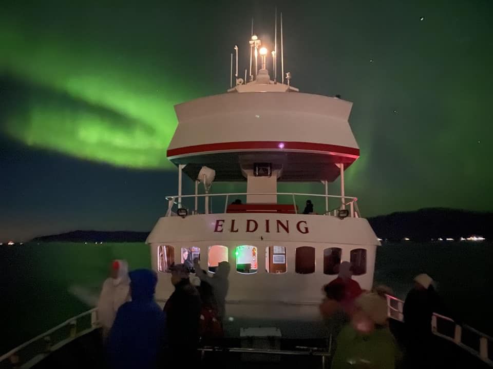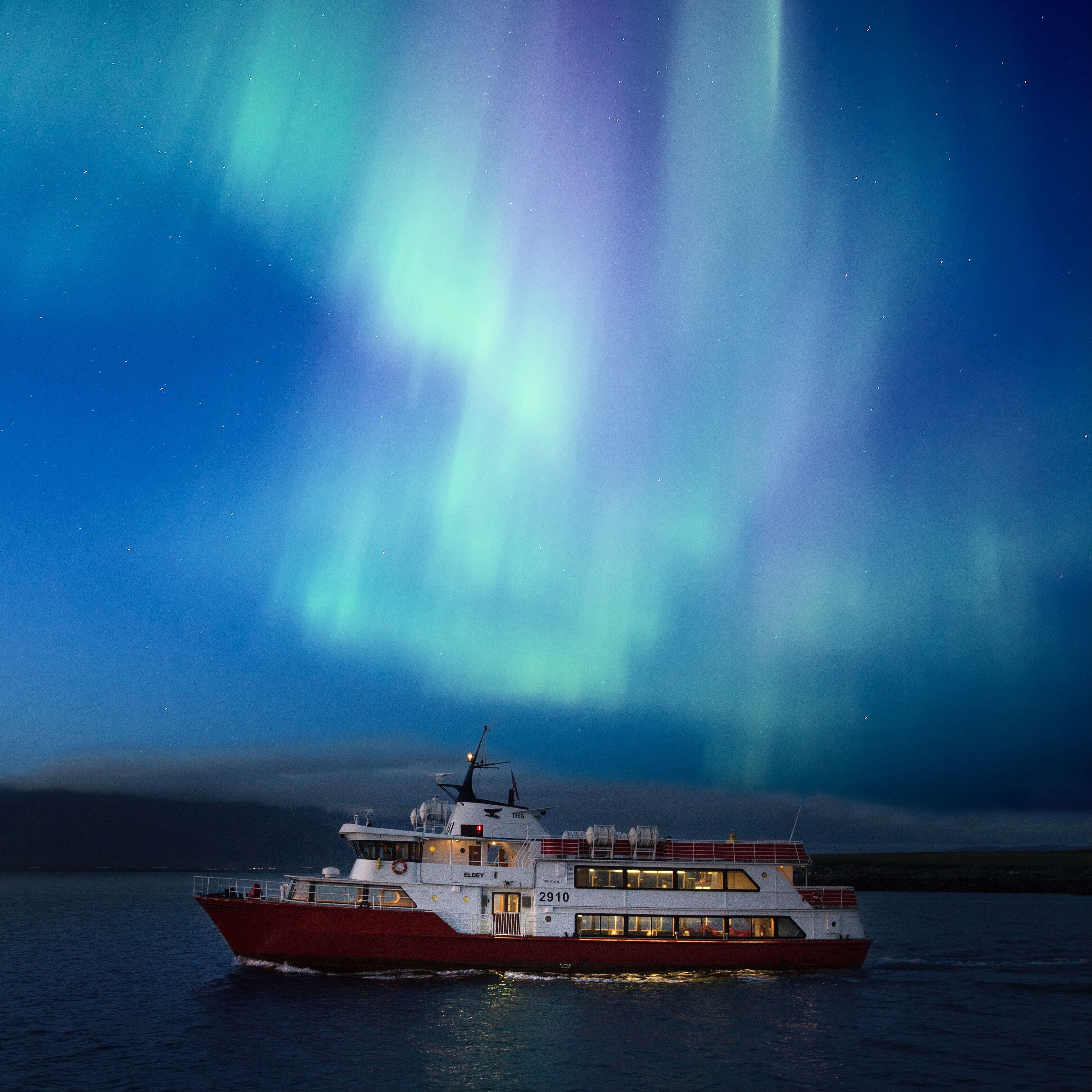 Once you have checked in at our ticket office, our team will direct you onwards to the boat. Enjoy around 2 hours at sea with our expert crew and specially trained naturalists on this Northern Lights & City Cruise. As we sail from Reykjavík’s Old Harbour, take in stunning views of the city’s illuminated skyline and landmarks such as Harpa Concert Hall and Hallgrímskirkja. When the Imagine Peace Tower is lit, we sail by to admire its radiant beam before heading further into the bay in search of the aurora borealis.